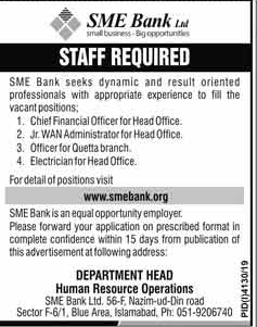 SME Bank Ltd. Staff Required in Islamabad For cash work