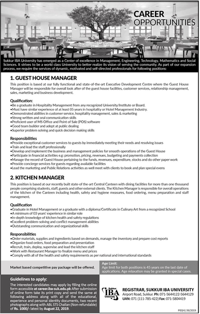 Sukkur IBA Univeristy has emerged as a Center of excellence in Management, ENgineering, Technology, Mathematics and Social Sciences. It strives to be a world class university to better realize its vision of serving the community. As part of our expansion process. We require the services of dynamic, motivated and self-directed professionals for following possitions.