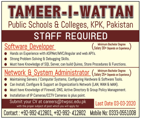 Jobs in Tameer-i- Wattan Public School and College KPK Staff Required