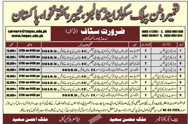 Jobs in Tameer Watan Public School and College KPK Staff Required Female