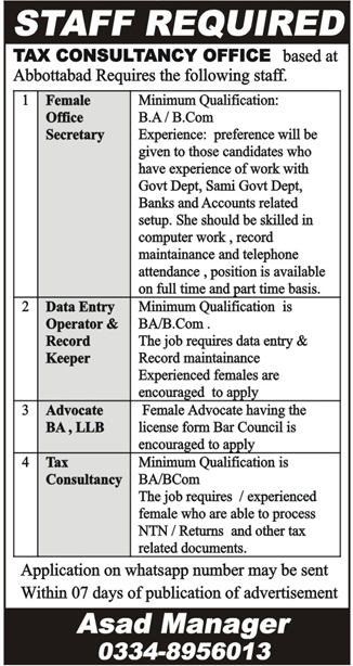 Tax Consultancy Office Staff required