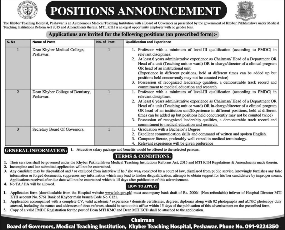 Jobs in The Khyber Teaching Hospital Peshawar Positions Vacant