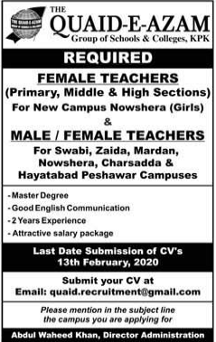 Jobs in The Quaid-i-Azam Group of School and College Male and Female Staff Required