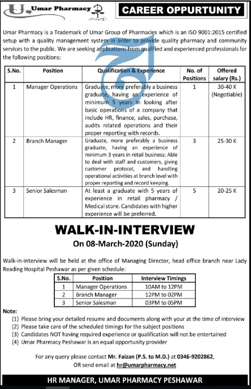 Jobs in Umer Group of Pharmacies Walk in Interview