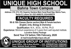 Jobs in Unique High School Bahira Town Campus Faculty Required