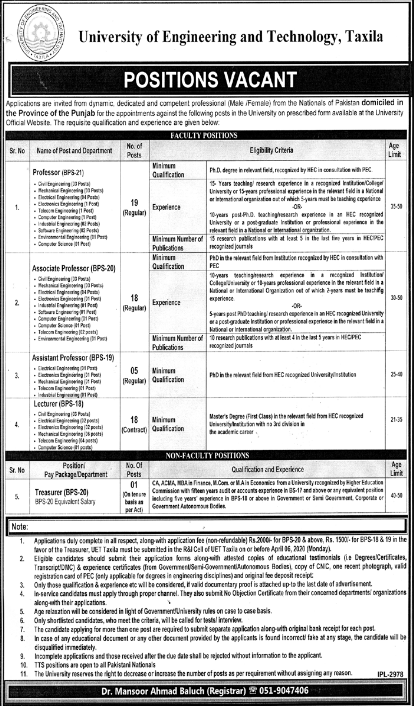 Jobs in University of Engineering and Technology Taxila Positions Vacant