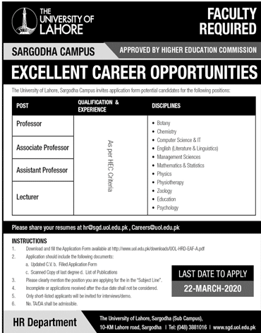 Jobs in University of Lahore Sargodha Campus Positions Vacant