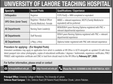 Jobs in University of Lahore Teaching Hospital Positions Vacant