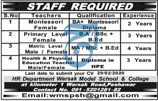 Jobs in Warsak Model School and College Staff Required