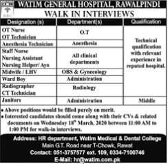 Jobs in Watim General Hospital Rawalpindi Walk in Interviews