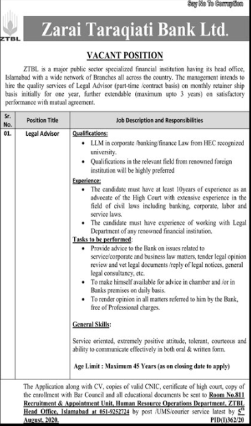 Job in Zari Taraqiati Bank Ltd Position Vacant